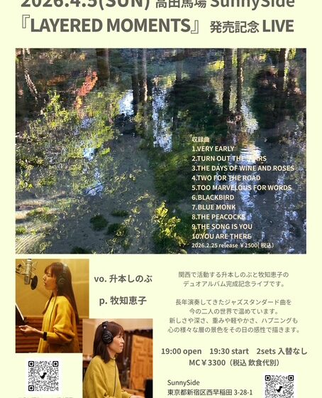 「LAYERED MOMENTS」発売記念ライブ(お席残り少なくなりました) 4月 5 Sun 2026 LIVE 19:30 〜 22:00 MC: ¥3,300 升本しのぶ(Vo)、牧知恵子(P) ☆関西で活躍されているお二人のデュオアルバム完成記念ライブ。 お席残り少なくなりました。お早目のご予約おまちしております!